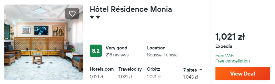 W Tunezji zatrzymasz się w Hôtel Résidence Monia, który znajduje się w miejscowości Susa, w odległości 300 metrów od plaży Bhar Ezzebla. Z lotniska Enfidha w okolice miejsca noclegowego dostaniesz się pociągiem lub taksówką.