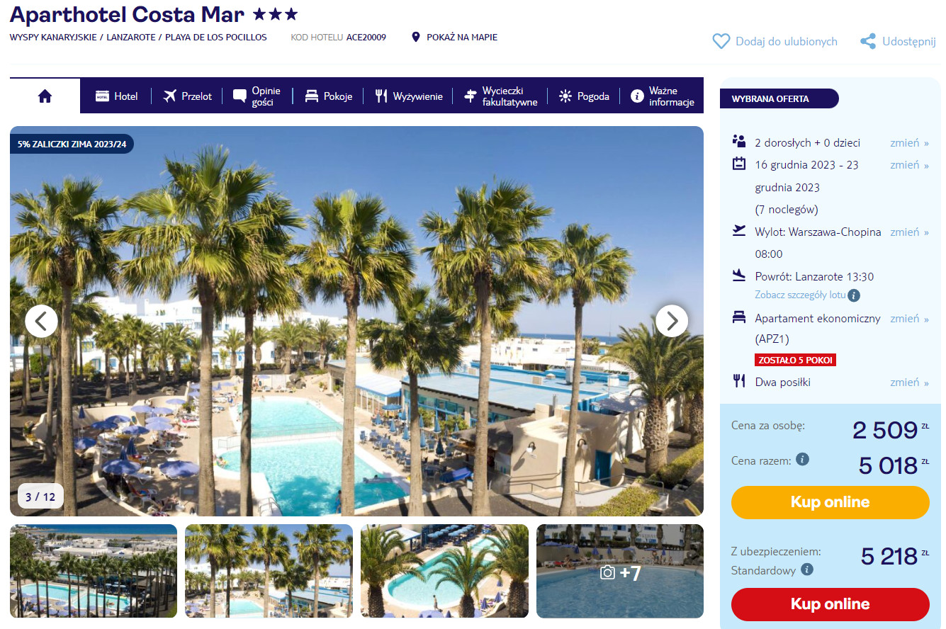 W cenie będziesz mieć zapewnione przeloty (w dwie strony), zakwaterowanie, transfery do/z hotelu, opiekę rezydenta oraz wyżywienie w formule half board (śniadania i obiadokolacje).