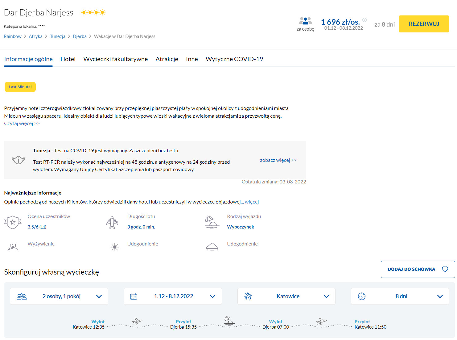 Na miejscu zatrzymasz się w bardzo dobrym 4* hotelu Dar Djerba Narjess. Obiekt oferuje lokalizację tuż przy piaszczystej plaży, odkryty basen, zielony ogród oraz restaurację serwującą specjały kuchni międzynarodowej w formie zróżnicowanego all inclusive.
