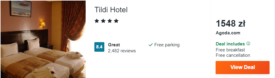 W Agadirze rekomenduję wam noclegi w 4* Tildi Hotel, który jest bardzo dobrze oceniany przez dotychczasowych gości. Zatrzymując się tutaj, będziecie mogli korzystać z dwóch basenów oraz siłowni. Odległość pomiędzy hotelem a plażą wynosi zaledwie 200 metrów!