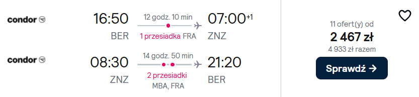 Do Afryki (Zanzibar) polecisz z Berlina. Na każdej trasie podróżować będziesz liniami Condor oraz Lufthansa z przesiadkami we Frankfurcie oraz stopie technicznym w Mombasie (przy powrocie z Zanzibaru).