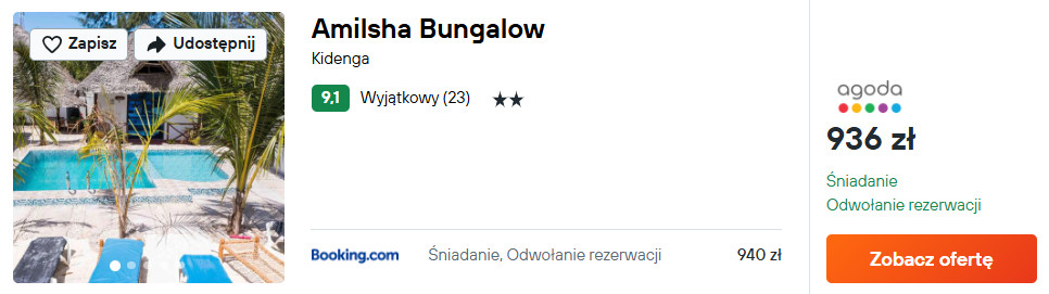 Zatrzymasz się w Amilsha Bungalow, w Kidenga – 400 metrów od plaży Jambiani. Idealne miejsce na spokojny wypoczynek nad oceanem. Na miejscu jest zewnętrzny basen otoczony tarasem i ogrodem, gdzie odpoczniesz po dniu spędzonym na plaży.