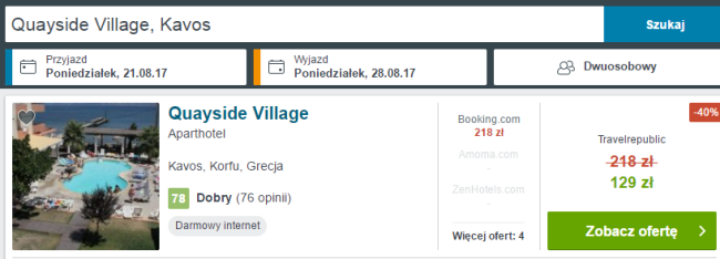 W terminie 21-28 sierpnia proponuję zakwaterowanie w Quayside Village za 905 PLN/2 osoby/7 nocy (452,5 PLN/osoba). Sprawdź bardzo dobre opinie obiektu >>