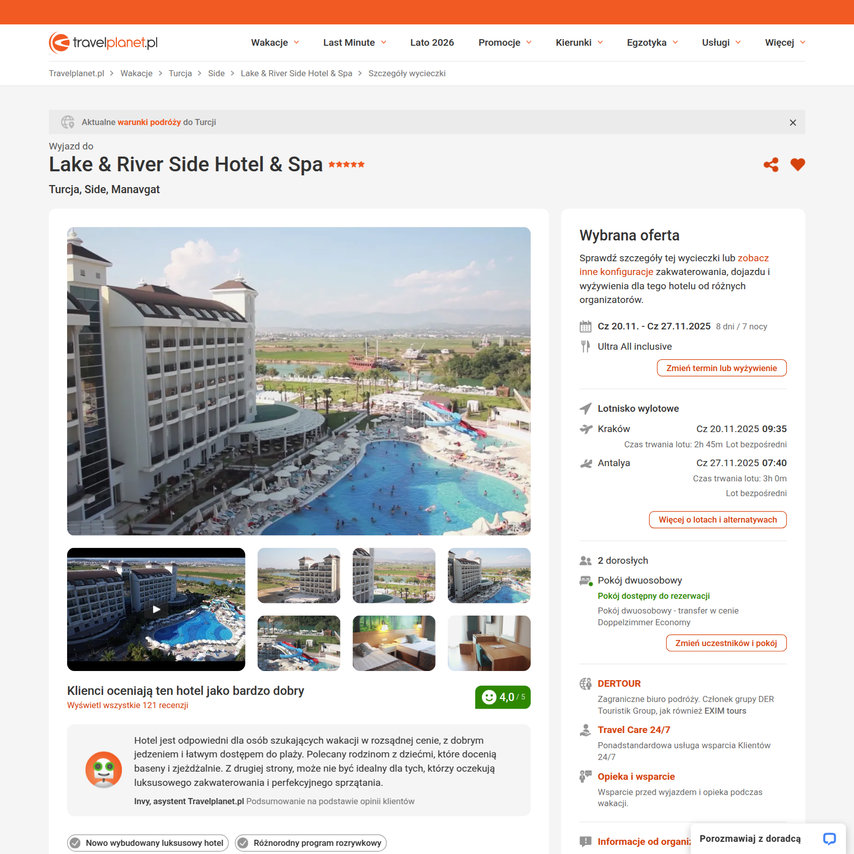 Lake & River Side Hotel & Spa to luksusowy 5* obiekt położony nad rzeką, około 7 km od historycznego centrum Side i 4 km od Manavgat. Hotel zachwyca gości przestronnymi basenami, w tym krytym podgrzewanym, kompleksem zjeżdżalni wodnych oraz eleganckim wystrojem. Goście szczególnie chwalą bogate wyżywienie, profesjonalną obsługę oraz różnorodny program animacyjny zarówno dla dorosłych jak i dla dzieci.