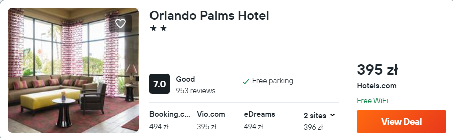 W Orlando proponuję ci zakwaterowanie w hotelu Palms. Do twojej dyspozycji zostanie oddany pokój z prywatną łazienką i dostępem do WiFi.