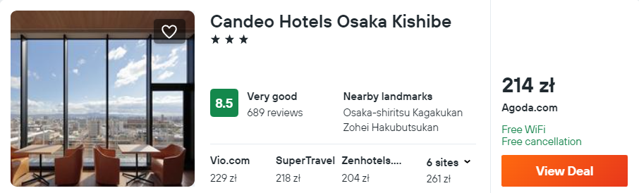 W Osace proponuję 3* Candeo Hotels Osaka Kishibe. Obiekt mieści się niedaleko centrum miasta i oferuje swoim gościom pokój z TV, balkonem, WiFi i prywatną łazienką.