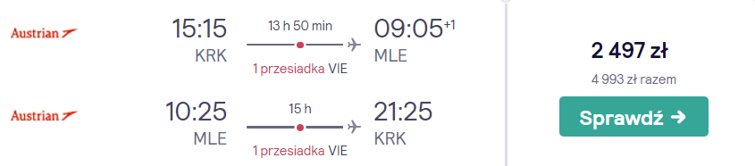 Na Malediwy polecicie w terminie 21(22)-31 stycznia. Na wstępnie zaznaczę, że w styczniu przypada okres najlepszej pogody oraz szczyt sezonu. Na wycieczkę (z przesiadkami w Wiedniu, gwarantowanymi przez przewoźnika) wybierzecie się na pokładzie samolotów linii lotniczych Austrian Airlines.