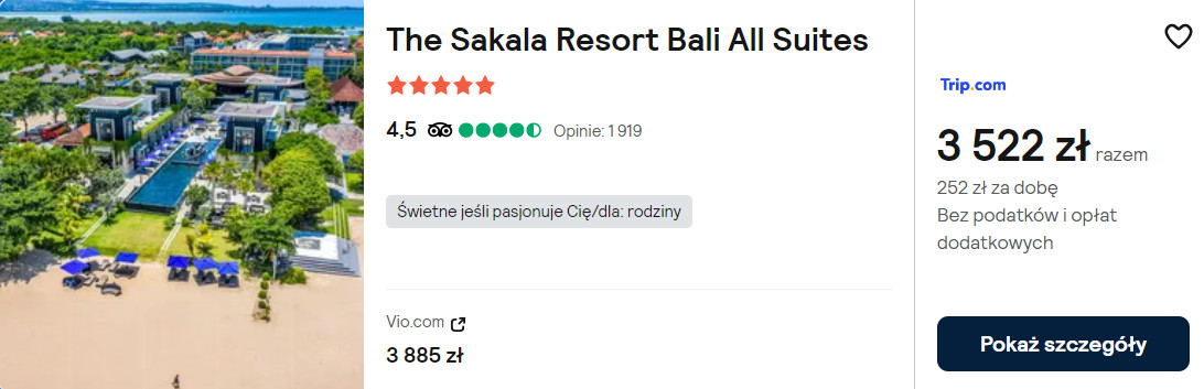 Na miejscu zatrzymasz się w 5* The Sakala Resort Bali All Suites, który znajduje się tuż przy plaży. Z lotniska do miejsca noclegowego dojedziesz taksówką za ok. 60 PLN.