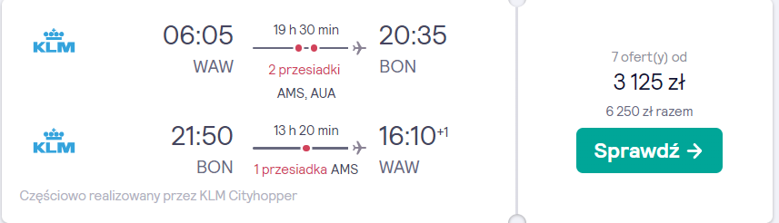 Na Bonaire polecicie w terminie 20 – 27 (28) stycznia z warszawskiego lotniska im. Fryderyka Chopina na pokładzie samolotów linii lotniczej KLM. Po drodze zaplanowano bezpieczne, gwarantowane przez przewoźnika przesiadki w Amsterdamie oraz techniczny stop na Arubie (bez opuszczania samolotu).
