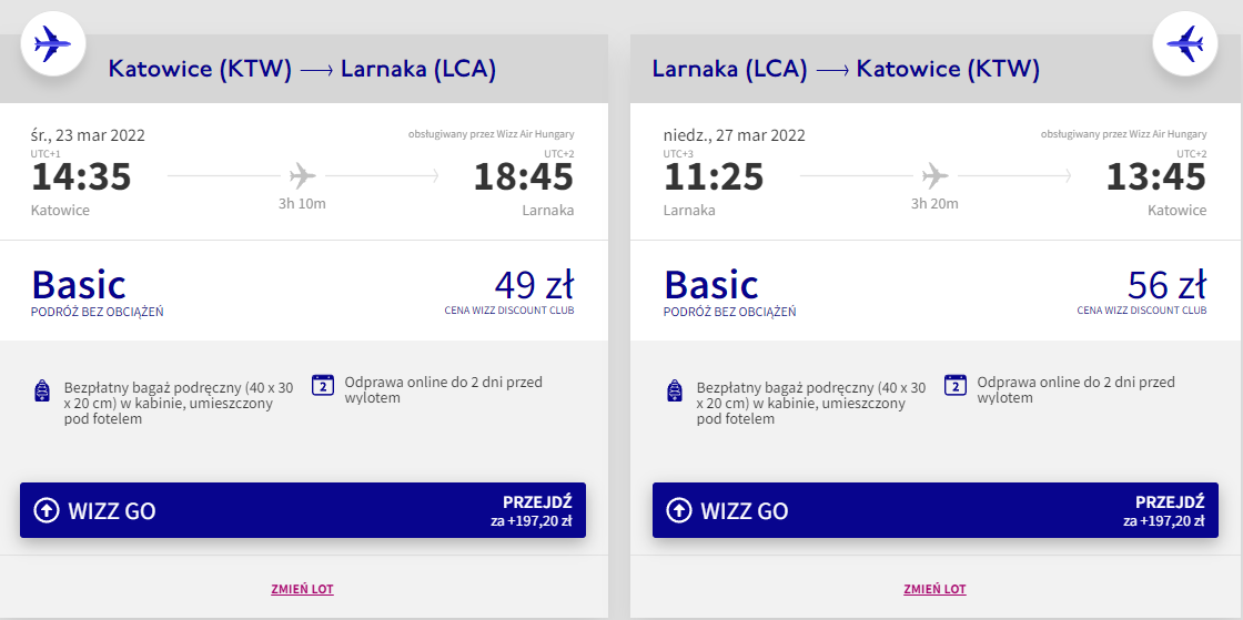 Do Larnaki polecicie w terminie 23–27 marca (środa-niedziela). Wasza podróż rozpocznie się na lotnisku w Katowicach, a loty będą realizowane na pokładach samolotów linii Wizz Air z wliczonym małym bagażem podręcznym.