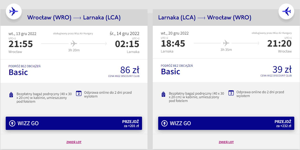 Do Larnaki udacie się w terminie 13-20 grudnia, z wrocławskiego portu lotniczego im. Mikołaja Kopernika. W obie strony polecicie na pokładach samolotów linii Wizz Air. Bilety w najniższej cenie dostępne są dla osób z Wizz Discount Club, chętni na loty bez WDC zapłacą nieco więcej.