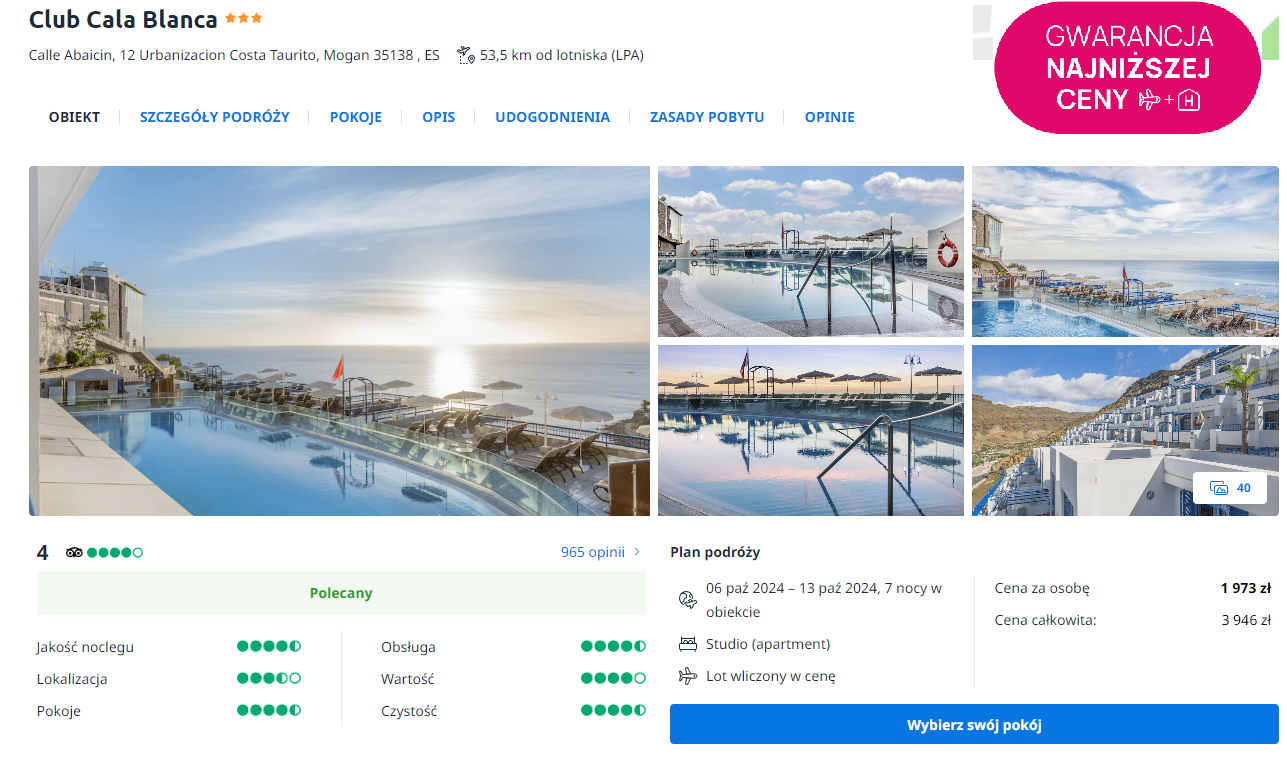 Na Gran Canarii zatrzymasz się w Club Cala Blanca, który położony jest w spokojnej okolicy, w pobliżu czarnej plaży Taurito, w kurorcie Mogán i oferuje fantastyczne widoki na ocean. Do twojej dyspozycji będzie basen i komfortowo wyposażony pokój.