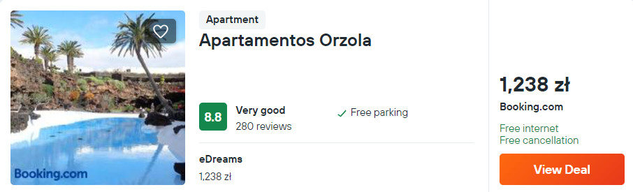 Na Lanzarote rekomenduję ci noclegi w obiekcie Apartamentos Orzola. Każdy apartament składa się z aneksu kuchennego, salonu, sypialni oraz łazienki z wanną i prysznicem. Na miejscu zapewniony jest bezpłatny parking oraz dostęp do sieci WiFi we wszystkich pomieszczeniach.