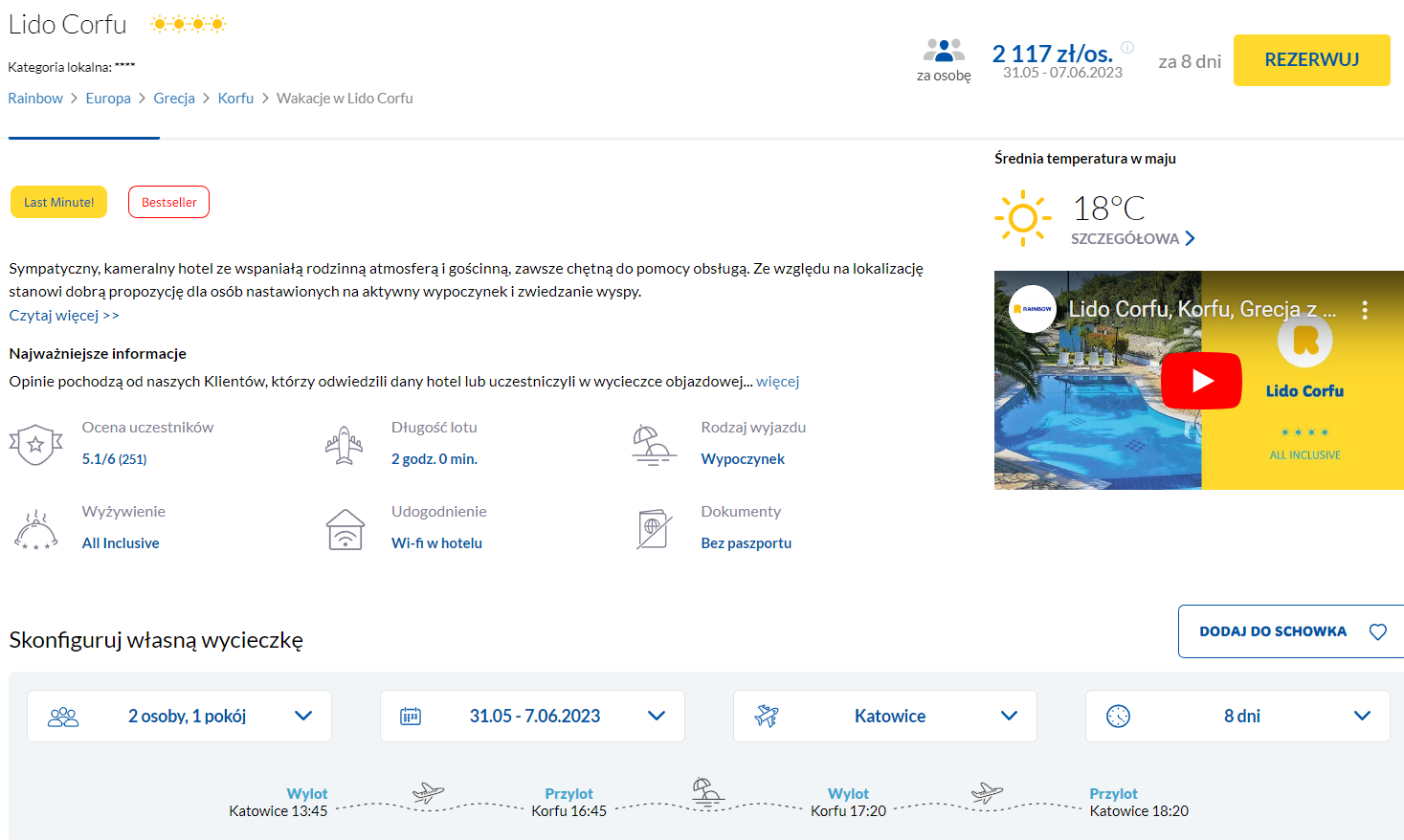 Do Grecji udasz się w dniach 31 maja – 7 czerwca. Na Korfu polecisz bezpośrednio z 3 polskich miast. W cenę pakietu wliczono podróż z bagażem rejestrowanym, transfery z lotniska do hotelu, opiekę rezydenta oraz wyżywienie w wygodnej formule all inclusive.