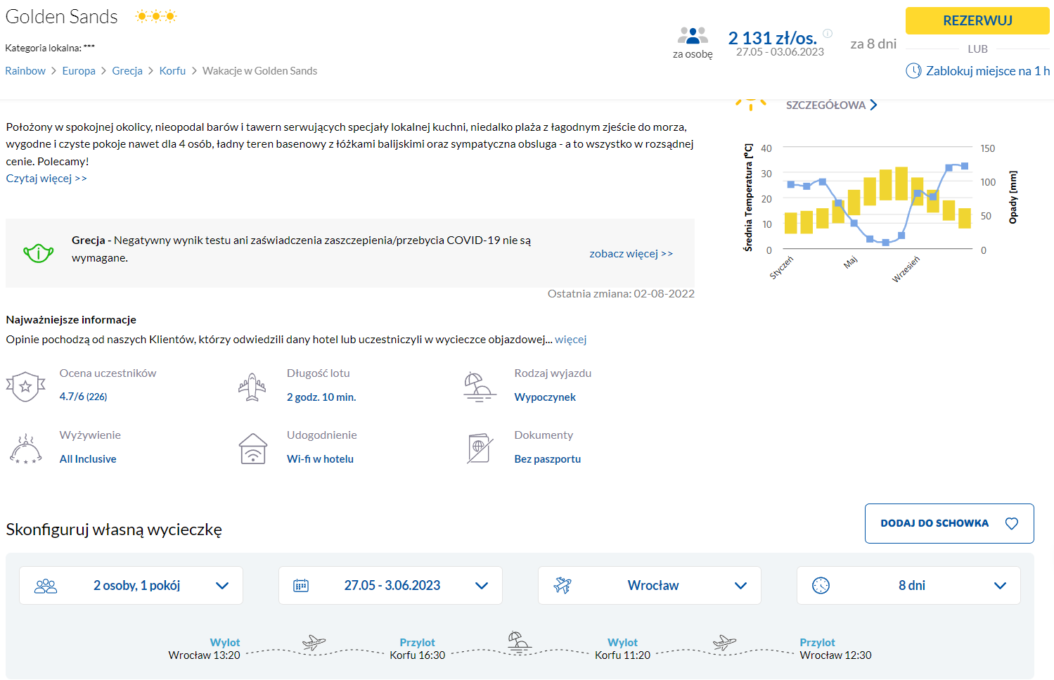 Do Grecji udasz się w terminie 27 maja – 3 czerwca. Czeka cię bezpośredni lot z 4 wybranych miast na Korfu. W cenę pakietu wliczono podróż z bagażem rejestrowanym (nadawanym do luku).