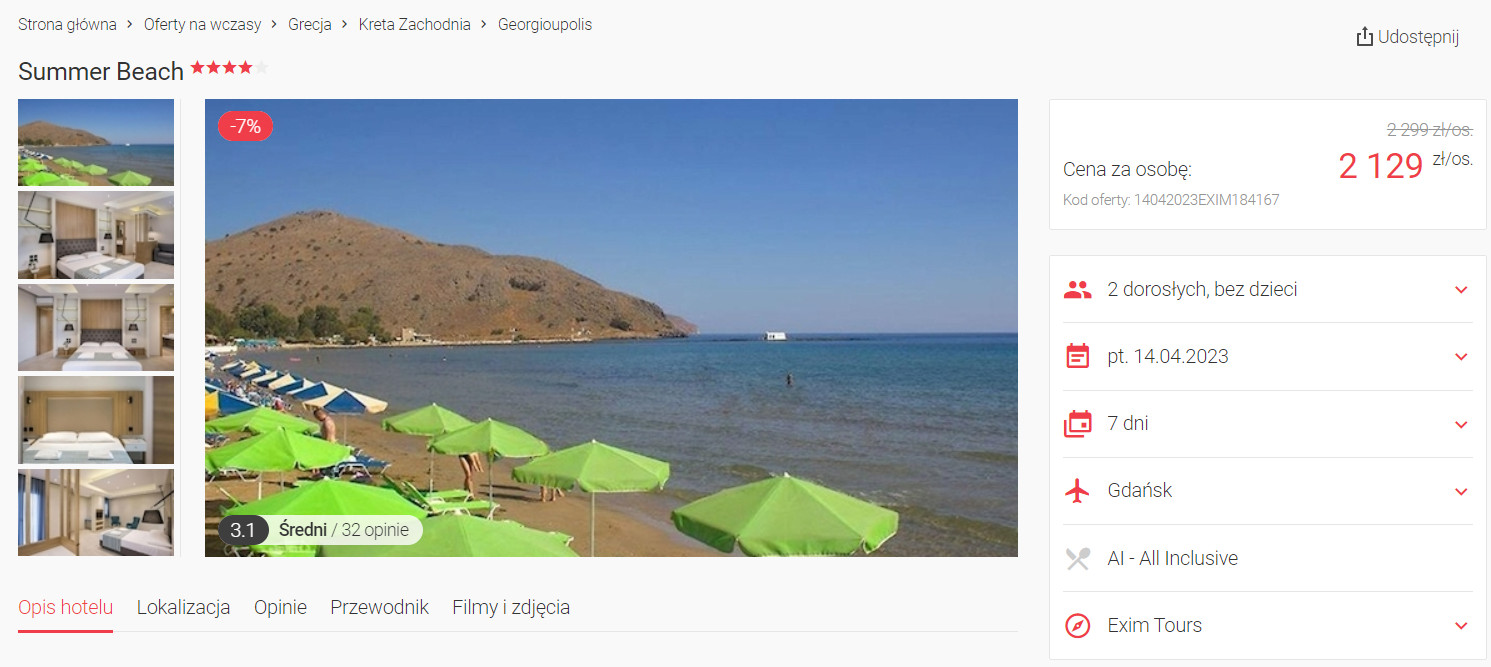 Na Krecie będziesz zakwaterowany w 4* hotelu Summer Beach, który zlokalizowany jest 350 m od piaszczystej plaży. Pokoje obiektu zostały nowocześnie urządzone i posiadają prywatne łazienki, klimatyzację, WiFi oraz balkon lub taras. Na miejscu znajdziesz odkryty basen, taras słoneczny i ogród.