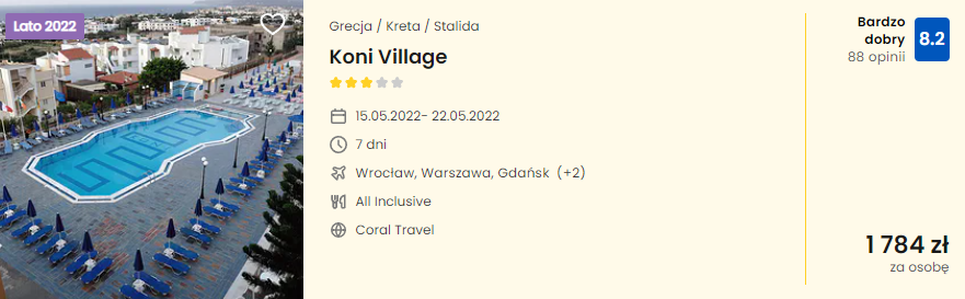 W podróż do Grecji udacie się w terminie 15–22 maja. Czeka was bezpośredni lot z wliczonym bagażem rejestrowanym z Warszawy, Poznania lub Wrocławia. Na Krecie będziecie zakwaterowani w 3* hotelu Koni Village. Do waszej dyspozycji będzie basen zewnętrzny i komfortowe wyżywienie all inclusive. Obiekt posiada dobre opinie dotychczasowych gości. 800 metrów od ośrodka znajduje się publiczna plaża. Na miejscu będziecie mogli skorzystać z wypożyczalni rowerów i sprzętu sportowego.