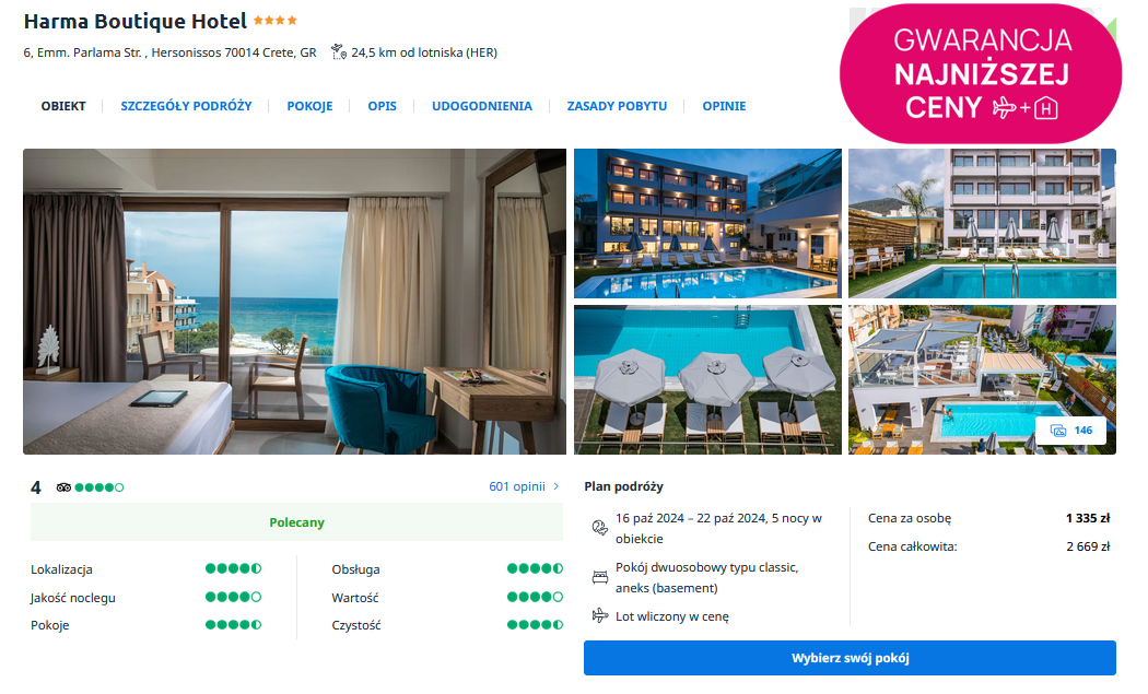 Na Krecie zatrzymasz się w 4* hotelu Harma. Do twojej dyspozycji będzie basen zewnętrzny z tarasem słonecznym, darmowe WiFi oraz przestronne studio z klimatyzacją, aneksem kuchennym, balkonem lub tarasem i prywatną łazienką. W cenę wliczone są śniadania i obiadokolacje.