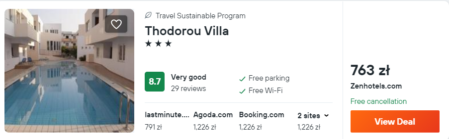 Na Krecie zatrzymasz się w 3* hotelu Thodorou Villa, który znajduje się w odległości 50 metrów od plaży Agia Marina. Z lotniska w okolice miejsca noclegowego (przystanek Agia Marina) dojedziesz autobusem lub wypożyczonym samochodem – szczegóły poniżej.