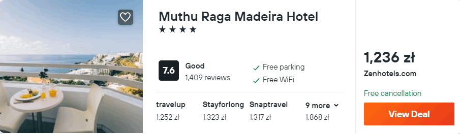 Na wyspie zakwaterowani będziecie w 4* hotelu Muthu Raga Madeira, który od centrum Funchal oddalony jest o 10 minut spokojnego spaceru. Z lotniska w okolice miejsca noclegowego dojedziecie autobusem za ok. 25 PLN lub wypożyczonym samochodem – szczegóły poniżej.