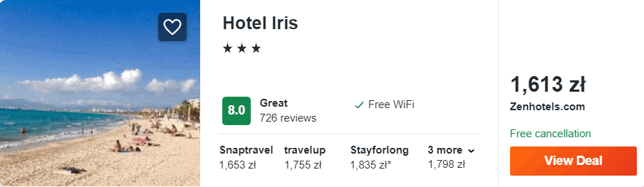 Na Majorce rekomenduję wam noclegi w 3* hotelu Iris, który od plaży oddalony jest o jedyne 50 metrów. Wszystkie pokoje są wyposażone w klimatyzację i telewizor LCD. W każdym jest łazienka z prysznicem i suszarka do włosów. Na terenie obiektu mieści się odkryty basen, a we wszystkich pomieszczeniach będziecie mieć zapewniony dostęp do sieci WiFi.