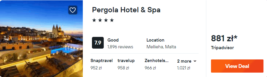 Na Malcie rekomenduję wam noclegi w 4* hotelu Pergola & Spa. Wszystkie pokoje wyposażone zostały w klimatyzację, telewizor, lodówkę oraz czajnik elektryczny. W łazience znajduje prysznic. Na terenie obiektu mieszczą się trzy baseny (w tym jeden kryty i to z podgrzewaną wodą), a we wszystkich pomieszczeniach będziecie mieli zapewniony dostęp do sieci WiFi.