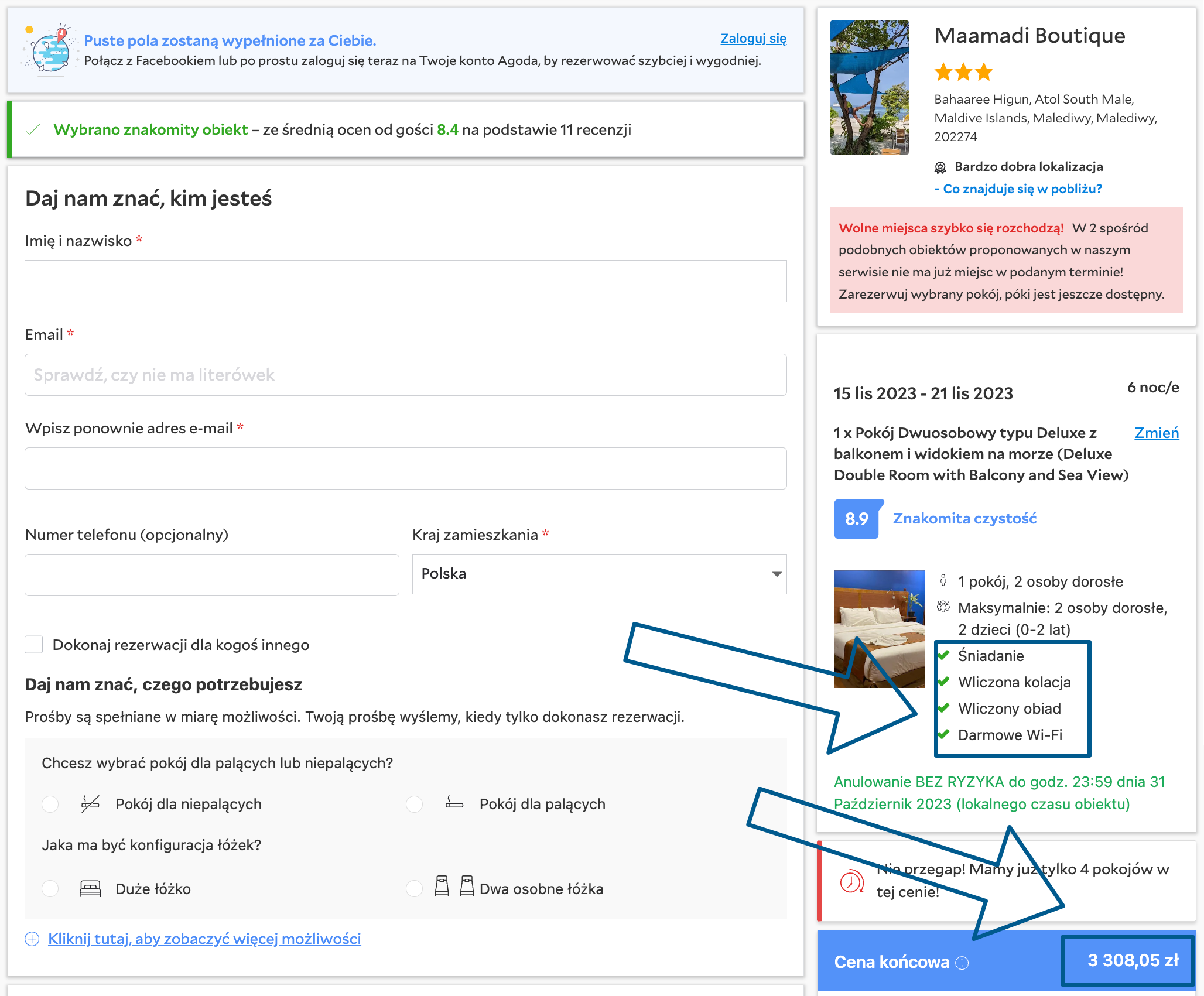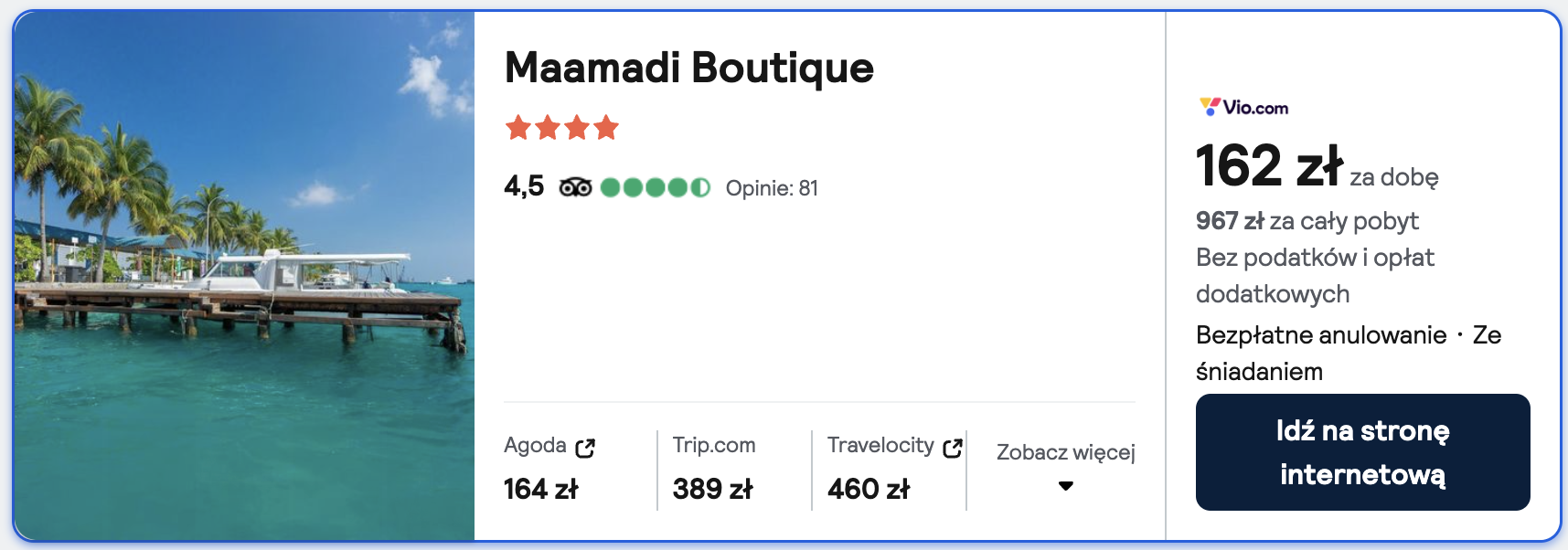 Na Malediwach zatrzymasz się w hotelu Maamadi Boutique, który usytuowany jest przy plaży na wyspie Maafushi. W cenie zakwaterowania zawarto codzienne śniadania, obiady i kolacje. Za transfer motorówką zapłacisz 40 USD (ok. 172 PLN) za osobę w obie strony.