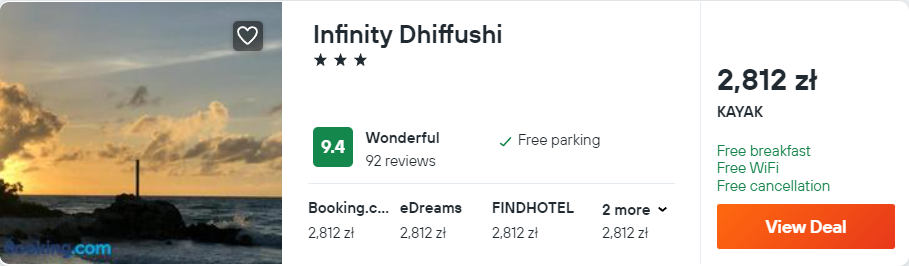 Na Malediwach zatrzymacie się w świetnie ocenianym hotelu Infinity, który położony jest na Dhiffushi. W cenie pobytu zapewnione będziecie mieli wyżywienie: śniadania i kolacje. Za transfer na wyspę zapłacicie 3 USD (około 14 PLN, stan kursu na dzień 16.08) w dwie strony za osobę.