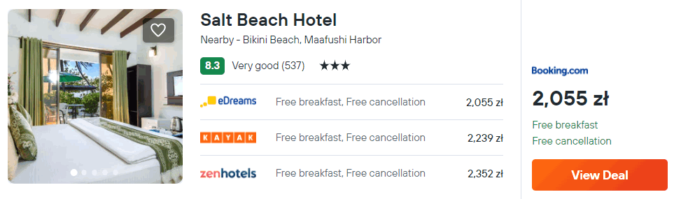 Na wyspie Maafushi rekomenduję ci noclegi z pełnym wyżywieniem (śniadanie, obiad, kolacja) w hotelu Salt Beach. Każdy pokój wyposażony jest w klimatyzację, wentylatory, telewizor oraz czajnik elektryczny. W łazience jest prysznic. Na terenie całego obiektu będziesz miał zapewniony dostęp do sieci WiFi. Ważne! Aby zarezerwować pobyt z wyżywieniem, proszę wybrać pośrednika Booking.com.