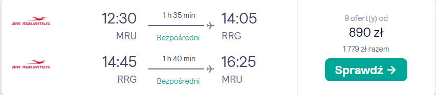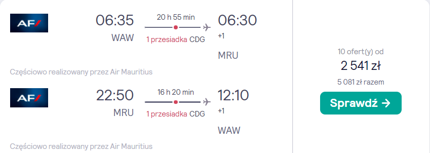 Na urlop do Afryki udacie się w terminie 30 (31) – 7 (8) stycznia. Czekają was loty z warszawskiego lotniska im. Fryderyka Chopina, realizowane na pokładzie samolotów linii lotniczej Air France i Air Mauritius.Po drodze zaplanowano bezpieczne przesiadki w Paryżu i na Mauritiusie.