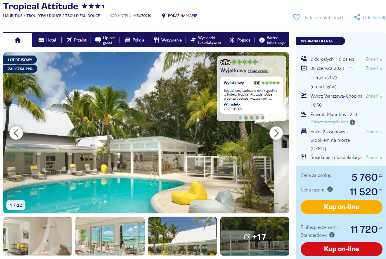 Na wyspie będziesz zakwaterowany w świetnym 3* hotelu Tropical Attitude, który położony jest pośród ogrodu palmowego. W sąsiedztwie mieści się przepiękna plaża. Na miejscu znajdziesz basen zewnętrzny, taras słoneczny i bogate zaplecze sportowe. W twoim pokoju będzie komfortowe łóżko, TV, klimatyzacja, balkon i prywatna łazienka. Dotychczasowi goście rewelacyjnie oceniają ten obiekt (5/5 na portalu TripAdvisor).