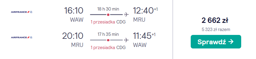 Z warszawskiego lotniska im. Chopina na Mauritius wybierzecie się w czerwcu (12-20.06). Na wyspę podróżować będziecie na pokładach samolotów linii Air France. Po drodze czekać was będą przesiadki na lotnisku w Paryżu – w razie jakichkolwiek opóźnień otrzymacie nowy bilet na dalszą podróż. Podczas międzykontynentalnych lotów możecie liczyć na catering w postaci dwóch posiłków, przekąsek oraz bezpłatnych napojów bezalkoholowych.