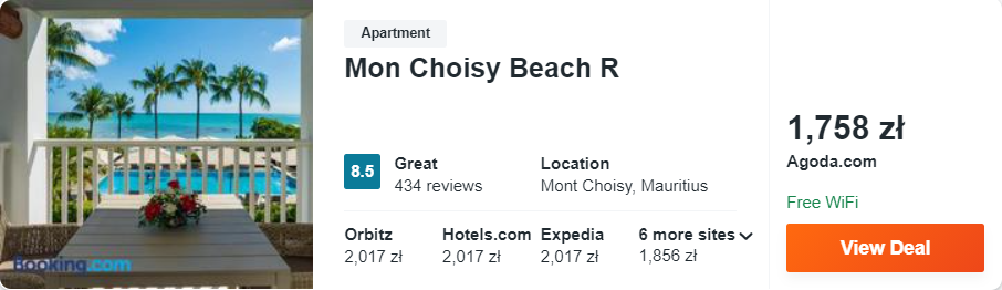Na Mauritiusie rekomenduję wam noclegi w kompleksie apartamentów Mon Choisy Beach R, który znajduje się tuż przy plaży Mon Choisy. Każdy z apartamentów posiada w pełni wyposażony aneks kuchenny, salon, sypialnię, łazienkę z prysznicem oraz taras lub balkon. Na miejscu zapewniony będziecie mieli dostęp do sieci WiFi, odkrytego basenu oraz tarasu słonecznego z leżakami.