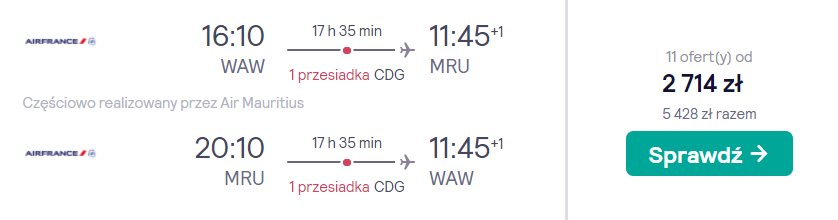 Na rajski wypoczynek wybierzecie się pomiędzy marcem a kwietniem w dogodnym terminie, który obejmuje święta wielkanocne. Podróżować będziecie z warszawskiego lotniska im. Chopina na pokładach samolotów linii Air France oraz Air Mauritius z krótkimi przesiadkami na lotnisku w Paryżu.