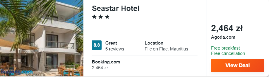 Na Mauritiusie zatrzymacie się miejscowości Flic en Flac w 3* hotelu Seastar, który od pięknej plaży o tej samej nazwie oddalony jest o kilka minut spacerem. W cenę zakwaterowania wliczone są codzienne śniadania. Z międzynarodowego lotniska w okolice proponowanego przeze mnie hotelu najtaniej dojedziecie autobusem za 73 MUR (ok. 7 PLN) lub taksówką za 45 EUR (ok. 202 PLN).