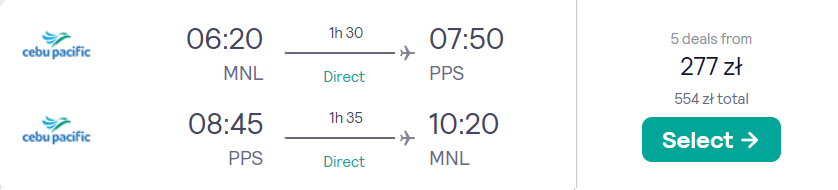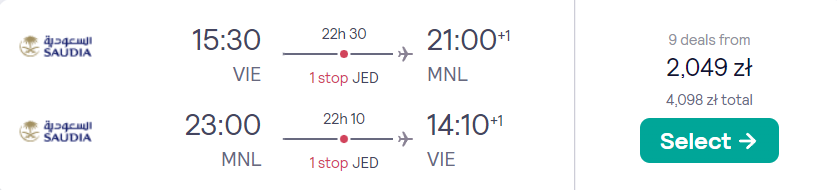 Wyjazd w tytułowej cenie składa się z dwóch rezerwacji: na loty z Wiednia do Manili, a następnie z Manili na Palawan. Czeka cię podróż na pokładzie samolotów linii lotniczej Saudia z przesiadkami w Dżuddzie, a następnie bezpośredni lot wewnątrz Filipin z linią Cebu Pacific.