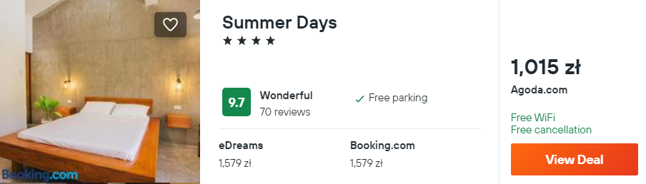 Natomiast na Palawanie wybrałam dla ciebie noclegi w 4* hotelu Summer Days. Obiekt będzie świetną bazą wypadową do zwiedzania wyspy. Dotychczasowi goście bardzo pozytywnie oceniają pobyt w tym miejscu.