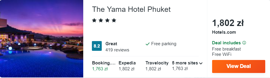 Na Phuket zakwaterowani będziecie w 4* The Yama Hotel Phuket, w cenę pobytu wliczone są codzienne śniadania. Z lotniska do oferowanego przeze mnie hotelu dojedziecie autobusem za ok. 13 PLN lub taksówką od 130 PLN.