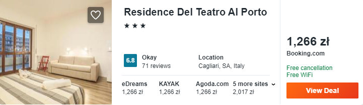 Na miejscu proponuję wam noclegi w Cagliari w 3* hotelu Residence Del Teatro Al Porto. Obiekt jest zlokalizowany w centralnej części miasta. Będziecie też mogli skorzystać z bezpłatnego Wi-Fi. Ponadto w pobliżu znajdują się liczne restauracje oraz port, w którym zobaczycie liczne statki, jachty i wycieczkowce.