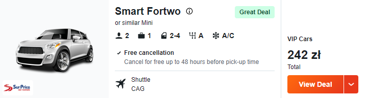 Jeśli chcecie zobaczyć więcej atrakcji wyspy, wypożyczcie samochód. Za tygodniowy wynajem Smarta Fortwo lub podobnego modelu zapłacicie w sumie 242 PLN.