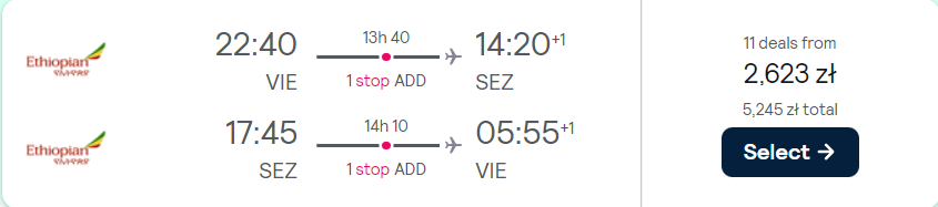 Do Afryki udasz się w terminie 17 (18) – 24 (25) października z lotniska w Wiedniu. W obie strony polecisz na pokładzie samolotów linii lotniczej Ethiopian Airlines z wygodnymi przesiadkami na lotnisku w Addis Abeba. W cenie możesz zabrać ze sobą bagaż podręczny i rejestrowany.