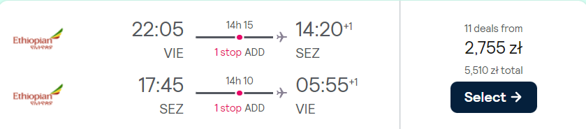Do Afryki udasz się w terminie 29 (30) maja – 5 (6) czerwca z lotniska w Wiedniu. W obie strony polecisz na pokładzie samolotów linii lotniczej Ethiopian Airlines z wygodnymi przesiadkami na lotnisku w Addis Abeba. W cenie możesz zabrać ze sobą bagaż podręczny i rejestrowany.