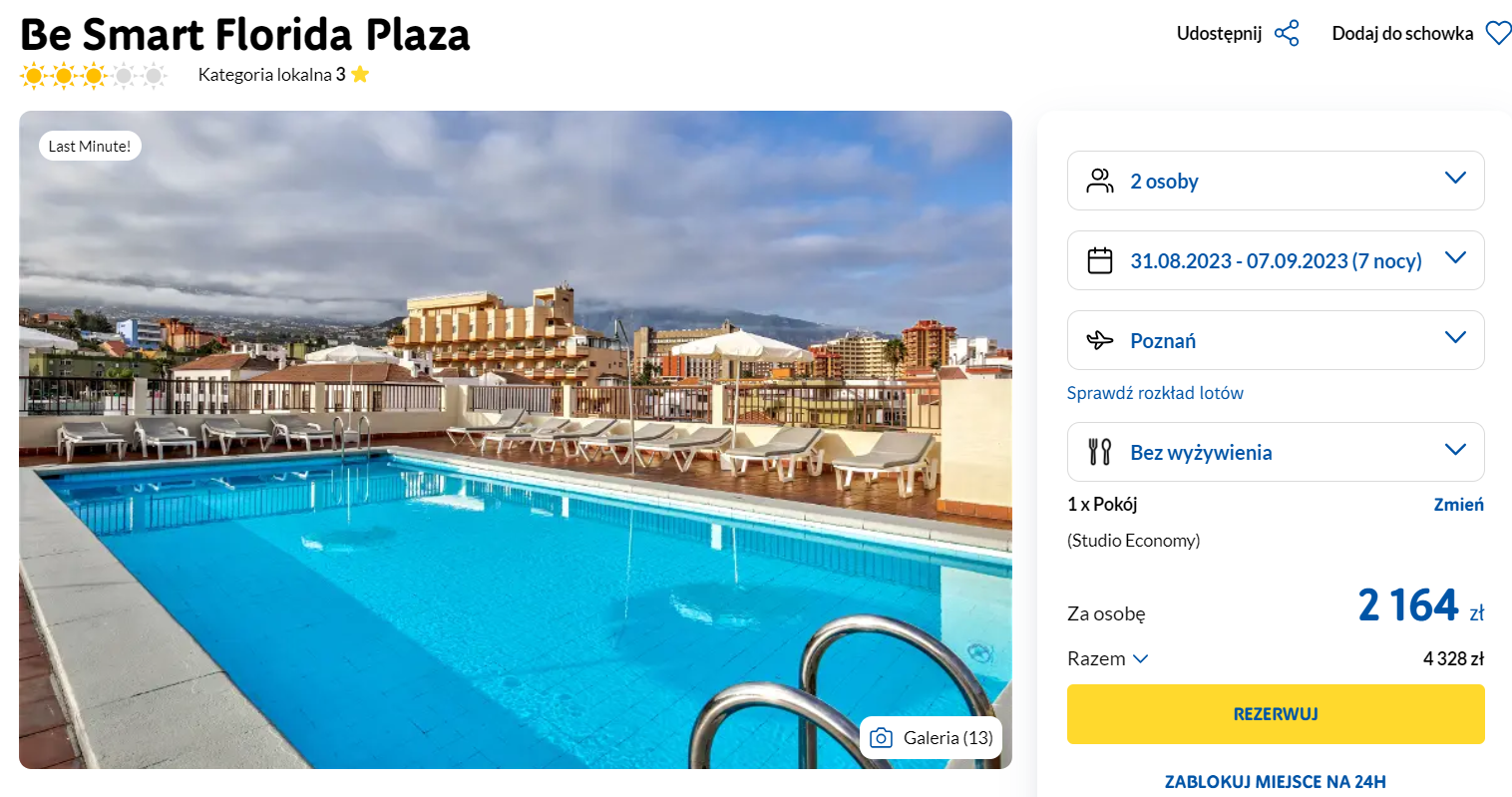 Na miejscu zatrzymasz się w hotelu Be Smart Florida Plaza, który znajduje się w miejscowości Puerto de la Cruz. Na terenie obiektu mieści się odkryty basen (leżaki i parasole przy basenie bezpłatne). Każde studio składa się z aneksu kuchennego, miejsca do relaksu i spania, łazienki oraz balkonu.