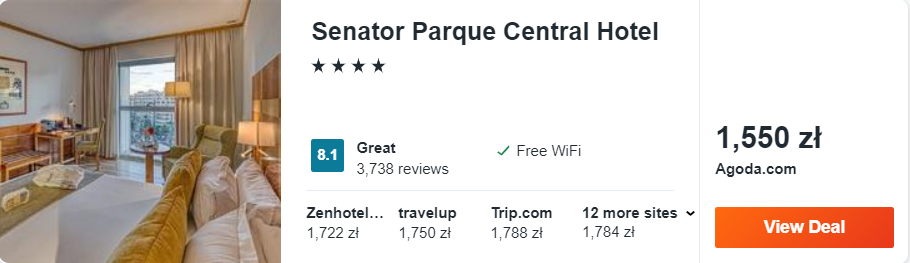 W Hiszpanii zatrzymacie się w Walencji, w bardzo dobrym 4* hotelu Senator Parque Central, który znajduje się nieopodal centrum miasta. Z lotniska w okolice proponowanego przeze mnie hotelu dojedziecie pociągiem metra nr 3 lub 5, a za bilet zapłacicie ok. 14 PLN.