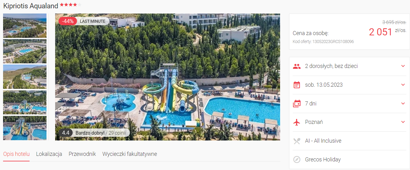 Na wyspie będziesz zakwaterowany w świetnie ocenianym ((4,5/5, ponad 2 tys. opinii na TripAdvisor) 4* hotelu Kipriotis Aqualand. Na miejscu do twojej dyspozycji będzie kompleks basenów z tarasem słonecznym, aquapark, bogate zaplecze sportowe oraz strefa spa. Każdy pokój wyposażony został w komfortowe łóżko, TV, WiFi oraz balkon lub taras.