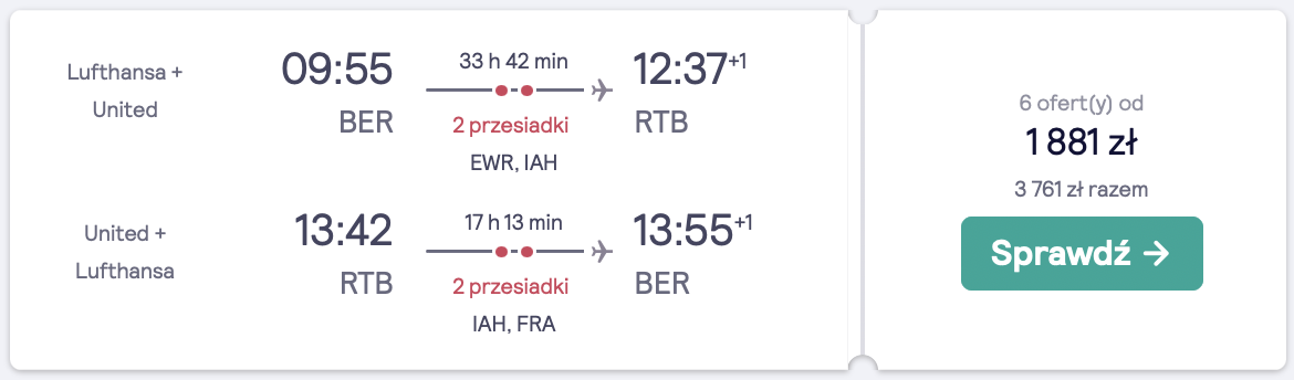 Do Hondurasu polecicie na pokładzie samolotów linii lotniczych Lufthansa i United w terminie 14(15) – 27 stycznia z lotniska w Berlinie, z przesiadkami w Nowym Jorku, Houston i Frankfurcie. W USA czeka was dłuższy przystanek. Rekomenduję wybrać noclegi w Ramada by Wyndham Houston Intercontinental Airport South.