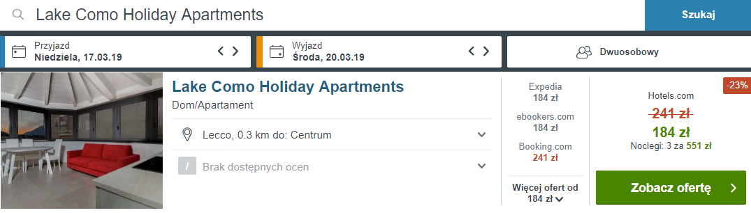 Przeloty realizowane są na pokładzie węgierskiej linii lotniczej Wizz Air. Aby uzyskać taką cenę, musisz być członkiem Wizz Discount Club. Apartament Lake Como znajduje się w mieście Lecco. Wszystkie pokoje są wyposażone w piekarnik, toster, ekspres do kawy, lodówkę i czajnik co pozwoli wam na przygotowywanie posiłków na miejscu. Polecam wam ten obiekt ze względu na swoje położenie. Pogoda powinna wam dopisać, w okresie podróży średnie temperatury dla tego regionu to ok. 15 stopni Celsjusza.