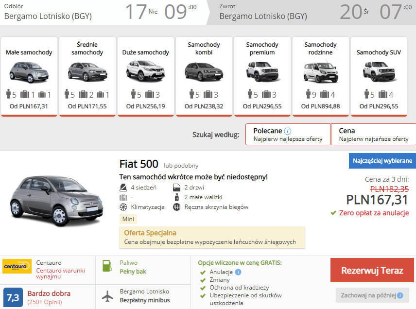 Wynajęcie auta za 167 PLN / 2 osoby (84 PLN / osoba)