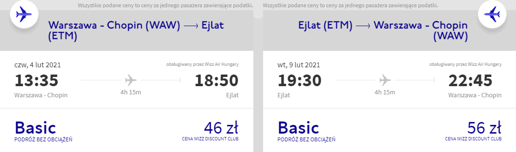 W podróż do Ejlatu wybierzecie się w terminie 4-9 lutego 2021 roku (czw.-wt). Bezpośrednie loty z Warszawy trwać będą około 4 godzin. Dzięki terminowi, który obejmuje część weekendu, zaoszczędzicie dwa dni urlopu. Najniższa cena zarezerwowana jest dla członków Wizz Discount Club. Pozostali zapłacą za bilety nieco więcej. Bez dodatkowych opłat polecicie z bagażem podręcznym.