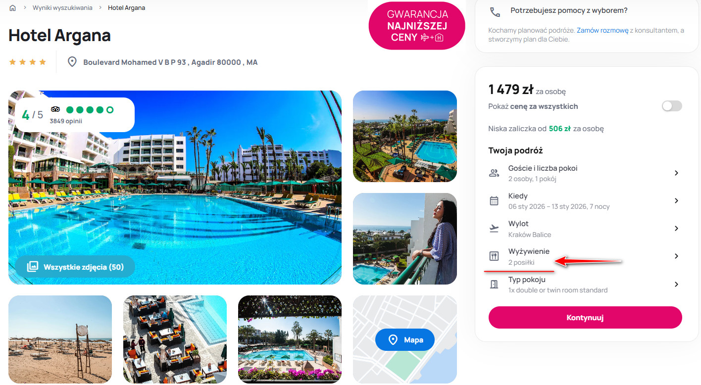 Na miejscu zatrzymasz się w 4* hotelu Argana Agadir, który znajduje się w centrum miasta, zaledwie kilka minut spacerem od plaży. W cenę pobytu wliczone są dwa posiłki dziennie serwowane w formie bufetu. Lokalizacja hotelu pozwala łatwo odkrywać atrakcje miasta oraz pobliski bulwar nadmorski.